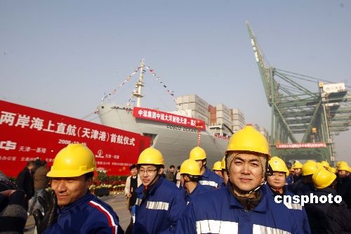 12月15日,海峽兩岸海上直航首航儀式在天津市天津港舉行。據(jù)悉,當(dāng)日舉行首航儀式的,大陸有天津、上海、太倉、福州、廈門、泉州6個(gè)港口,臺(tái)灣有基隆、高雄2個(gè)港口,參加首航的船公司13家,其中大陸9家公司15艘船舶,臺(tái)灣4家公司5艘船舶。中新社發(fā) 盛佳鵬 攝