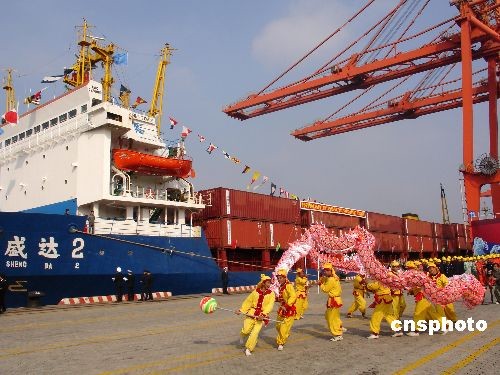 12月15日上午,廈門港4艘集裝箱貨輪“盛達2”輪、“錦春”輪、“曉江”輪、“華航1”輪,在人們的喝彩聲中緩緩啟航,直航高雄港、臺中港、基隆港。從1997年4月開始獲準開通對臺“試點直航”、積累了10多年對臺航運經(jīng)驗的廈門港從此升級。中新社發(fā) 楊伏山 攝