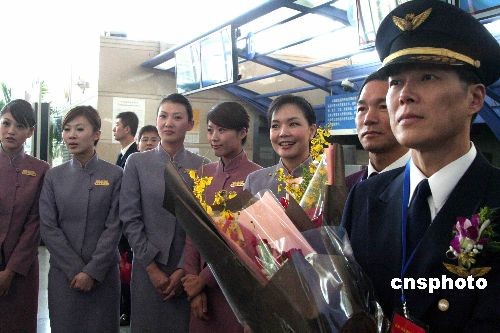 臺(tái)灣地區(qū)中華航空的CI七九八九越過(guò)海峽,于十二月十五日十點(diǎn)十分飛抵浙江杭州蕭山機(jī)場(chǎng)。機(jī)身上印著臺(tái)灣的水果。中新社發(fā) 汪恩民 攝