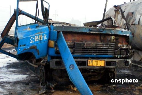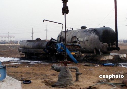 2008年12月16日,山東濱州,一盜竊原油的大罐車前端被炸開,駕駛室被炸飛,四周散落著汽車殘骸,現(xiàn)場沒有發(fā)現(xiàn)傷亡人員。據(jù)現(xiàn)場附近保安講,當(dāng)天凌晨5時,一陣巨大爆炸聲突響,他們走出廠區(qū)才知道是附近油井方向起火爆炸,隨后又接連傳來兩次爆炸聲。濱州消防出動三輛消防車,迅速將大火撲滅。據(jù)警方透露,盜油者在盜油時,產(chǎn)生電火花引發(fā)汽車起火,爆炸后棄車逃跑,盜油車和儲油罐相距1米,幸虧消防官兵及時撲救,避免了一場更大災(zāi)難發(fā)生。中新社發(fā) 唐劍 梁效 攝