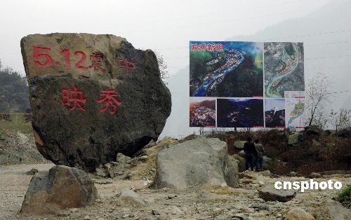 圖:地震災區(qū)汶川縣映秀鎮(zhèn)在巨石上刻字留念