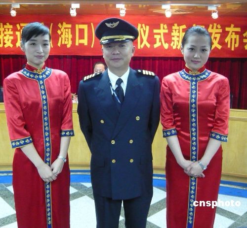 十二月二十日,海口-臺北將首開直航航線。海南航空為順利完成此次首航,特別推出精干的機組人員。機長蒲明(中)曾執(zhí)飛2005年兩岸春節(jié)包機最后一個航班。乘務長和頭等艙乘務員在去年以來都曾執(zhí)飛過兩岸中秋、春節(jié)包機。中新社發(fā) 王辛莉 攝