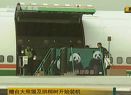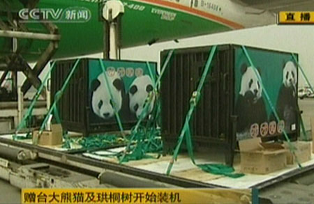 贈臺大熊貓“團團”、“圓圓”23日飛赴臺灣。大陸有關部門在成都雙流機場舉辦“贈臺大熊貓及珙桐樹赴臺歡送儀式”,目前儀式已結束,開始裝運大熊貓和珙桐樹。