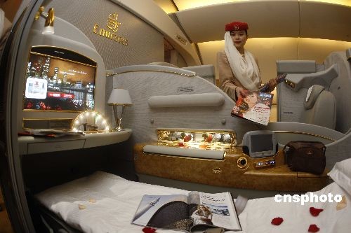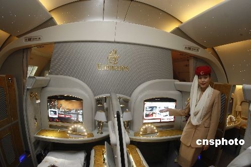 12月23日,“阿聯(lián)酋航空波音B777-200LR型飛機展示活動”在北京首都國際機場舉行,介紹其即將在北京往返迪拜的EK306/307航班上啟用波音B777-200LR型飛機,該機型安裝了頭等艙私人包間,可隨意開關(guān)的屏風(fēng)為乘客打造極致私密的空間,并配備了個人專屬儲物空間、衣櫥、梳妝臺及個人迷你酒吧、加長型平躺座椅等。遍布機艙的 “星空模擬”情緒照明系統(tǒng)可以幫助乘客調(diào)整生物鐘,減少因倒時差而帶來的身體不適。圖為美麗空姐介紹頭等艙私人包間特色細(xì)節(jié)。中新社發(fā) 盛佳鵬 攝