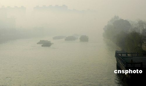 12月25日早上6時(shí)56分,杭州市氣象臺(tái)發(fā)布大霧黃色氣象預(yù)警,從早上7時(shí)起,濱江區(qū)、錢(qián)塘江兩岸及部分城區(qū)出現(xiàn)能見(jiàn)度小于500米的濃霧,對(duì)交通出行帶來(lái)一定影響。圖為在京杭大運(yùn)河杭州段,濃霧中列隊(duì)通行的船只。中新社發(fā) 金斌 攝