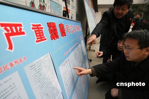 12月25日,法官在觀看有嚴重瑕疵的司法文書制成的展板。當日,為維護法院生效裁判文書的嚴肅性,提高法院的審判質量、司法文書制作水平,該市魏都區(qū)人民法院將本省近年來存在嚴重瑕疵的司法文書制成展板作為反面教材,在法院內部進行展示,教育廣大法官引以為戒,舉一反三,對照檢查自己在工作中存在的不足。中新社發(fā) 牛書培 攝