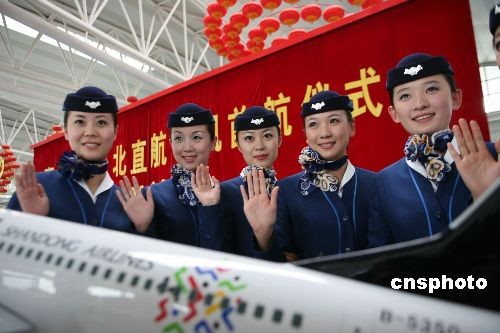 十二月二十六日下午三點(diǎn),青島-臺北直航班機(jī)從青島流亭國際機(jī)場起飛,駛向臺北桃園國際機(jī)場,拉開青島臺北兩市直航的序幕。此后,每周二、周五各有一班常態(tài)包機(jī)航班從青島直飛臺北。青島臺灣直航后,旅程由原來七個小時縮短到兩個半小時,費(fèi)用節(jié)約百分之三十,實(shí)現(xiàn)兩岸一日生活圈的夢想。圖為在首航直飛包機(jī)航班上服務(wù)的部分乘務(wù)人員在慶祝直航儀式上。中新社發(fā) 王群 攝