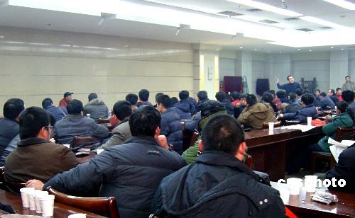 12月26日下午3時許,三鹿液態(tài)奶山東經(jīng)銷商聚集石家莊市三鹿集團(tuán)總部討要貨款,在得知此次石家莊市政府新出臺的還款方案并未涉及山東液態(tài)奶經(jīng)銷商后,百余經(jīng)銷商情急之下登至三鹿集團(tuán)五層高的辦公樓樓頂,直至當(dāng)?shù)靥鼐鰟,將?jīng)銷商們勸下樓頂,事態(tài)才得以控制,整個過程持續(xù)近一小時。圖為山東經(jīng)銷商被請進(jìn)會議室后,與三鹿集團(tuán)有關(guān)負(fù)責(zé)人就還款事宜進(jìn)行協(xié)商。中新社發(fā) 牛琳 攝