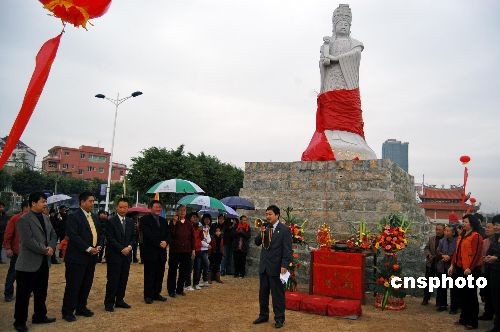 十二月二十七日,臺灣鹿港天后宮敬贈媽祖神像揭彩儀式在福建泉州霞洲媽祖宮舉行。由臺灣鹿港天后宮專門敬贈的一尊高五米、底座三米的媽祖神像,放置在霞洲媽祖宮外,供善男信女朝拜。霞洲媽祖宮迄今有近四百年的歷史,在政府撥款三百七十萬元人民幣重建媽祖宮的過程中,得到了眾多海外僑胞特別是臺灣同胞的慷慨解囊。中新社發(fā) 傅丹丹 攝