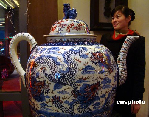 2009年1月2日,一名女士在觀賞景德鎮(zhèn)陶瓷巨壺。近日,一把可供300人同飲的景德鎮(zhèn)陶瓷巨壺在蘇州一家陶瓷商店亮相。據(jù)了解,這把陶瓷巨壺高約120厘米,壺身直徑約85厘米。中新社發(fā) 王建康 攝