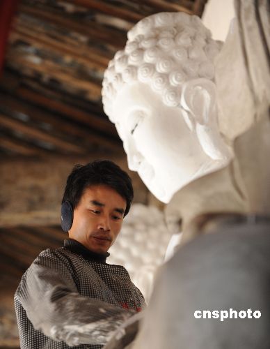 在四川大地震中受到損壞的北川縣古建筑黃恩寺,泥塑工匠新年伊始精心修復主殿三圣佛像。這座明末清初始建后歷代維護的古建筑,地處今春將開工的北川縣城新址中心位置。中新社發(fā) 賈國榮 攝