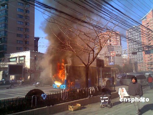 今天下午二點(diǎn)五十分左右,上海一輛八五四路公交車在行駛途中,突然起火燃燒,所幸車上并無乘客,只有司機(jī)和售票人兩人,沒有造成人員受傷。中新社發(fā) 宣克炅 攝