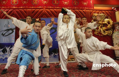 中國(guó)內(nèi)地戲劇作品將首次登陸百老匯舞臺(tái)。1月13日起,大型中國(guó)功夫劇《少林武魂》將在美國(guó)紐約百老匯連演二十四場(chǎng),從而為“中國(guó)在百老匯”系列演出拉開(kāi)序幕。1月11日,《少林功夫》主要演員在紐約舉行見(jiàn)面會(huì)并集體“亮相”。中新社發(fā) 魏晞 攝