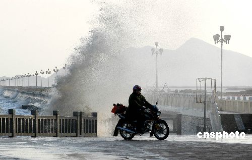 1月14日,江蘇連云港受北方冷空氣影響,海上出現(xiàn)7至8級(jí)偏北大風(fēng),沿海海邊出現(xiàn)巨浪,洶涌的海浪與岸邊的礁石相撞擊,卷起層層雪一樣的浪花,海邊港灣不時(shí)可見(jiàn)大風(fēng)掀起10米多高的巨浪。 中新社發(fā) 王春 攝