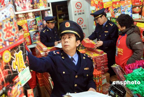 一月十九日,是北京2009年春節(jié)銷售煙花爆竹的首日,為保障市民安全歡度新春佳節(jié),西城工商執(zhí)法檢查人員對首日開始銷售的市場進行檢查。中新社發(fā) 任海霞 攝