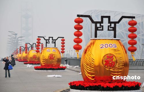 2009年1月21日,北京奧林匹克公園中軸線兩側(cè)安置的眾多巨型落地燈籠為即將到來的牛年春節(jié)增添了濃濃的喜慶氣氛,也吸引了眾多游客拍照留念。中新社發(fā) 樊甲山 攝