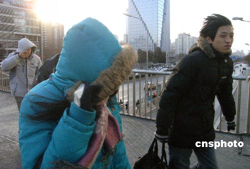 2009年1月22日,在京城東三環(huán)的跨線橋上,行人冒著寒風(fēng)趕路。此前北京市氣象臺(tái)第二次發(fā)布寒潮藍(lán)色預(yù)警,北京市將刮起4到5級(jí)北風(fēng),最高溫降幅將達(dá)到10℃左右,周五凌晨平原地區(qū)最低氣溫將降至-14℃。中新社發(fā) 馬毅行 攝