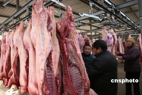 1月22日下午,河南省開封市南郊一生豬定點屠宰廠里人們正在批發(fā)豬肉。春節(jié)將至,開封市豬肉市場生意日益紅火。有關(guān)部門加大市場監(jiān)管力度,堅決杜絕經(jīng)營私屠濫宰肉、注水肉、超期變質(zhì)肉、假冒品牌肉、缺少證照等違法現(xiàn)象,讓人民群眾吃上“放心肉”。中新社發(fā) 凱楓 攝