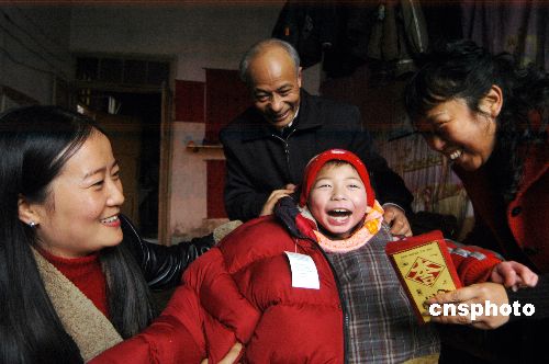 新年即將到來(lái),四川省綿陽(yáng)市民政局組織福彩中心、市梓潼兒童福利院開(kāi)展“愛(ài)心助孤過(guò)年活動(dòng)”,為家庭寄養(yǎng)孤兒送去慰問(wèn)金、防寒服、水果、糖等年貨。圖為殘疾人蘇太金家,市民政局工作人員為寄養(yǎng)的7歲孤兒涪斌穿上防寒服。中新社發(fā) 成和平 攝