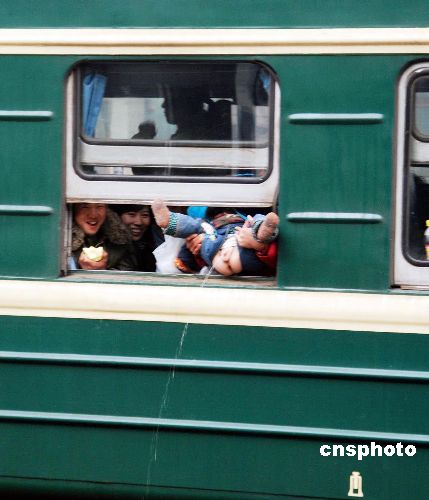 1月21日,在江蘇丹陽火車站,一輛列車?吭谡九_上,一位母親將兒子抱出窗外小便,場景既有趣又讓人感到不安。中新社發(fā) 封波 攝