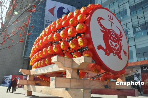 1月25日是農歷大年三十,在鄭州市花園北路新瑪特廣場,矗立起一座高8米、長8.5米、由280個大紅燈相連所組成的“巨型迎春鼓燈”。中新社發(fā) 劉書亭 攝