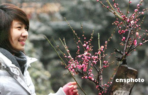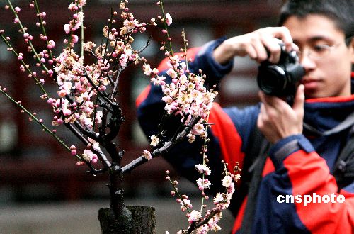 1月29日,一名游客在蘇州獅子林內(nèi)拍攝梅花盆景。為期1個(gè)月的蘇州園林“迎春梅花展”目前正在古典園林獅子林舉辦,共展出的近百盆不同品種的梅花盆景姹紫嫣紅,競相綻放,為新春節(jié)日期間的古典園林增添靚色,吸引許多中外游客及攝影愛好者游園賞梅。中新社發(fā) 王建中 攝