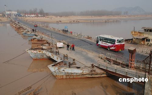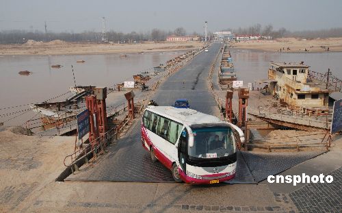 2009年1月29日,車輛從剛恢復通車的濼口浮橋上通過。由于近期氣溫回升,黃河濟南段流凌密度降至10%以下,截至上午8時,濼口段流量保持在248立方米/秒以下,持續(xù)一個多月的凌汛已經大幅度緩解。據(jù)濟南黃河防汛辦公室專家稱,近期黃河下游不會形成嚴重凌汛。濼口浮橋下游的章丘、歷程、濟陽有10段封河,封河長度在25公里左右。中新社發(fā) 滕越 攝