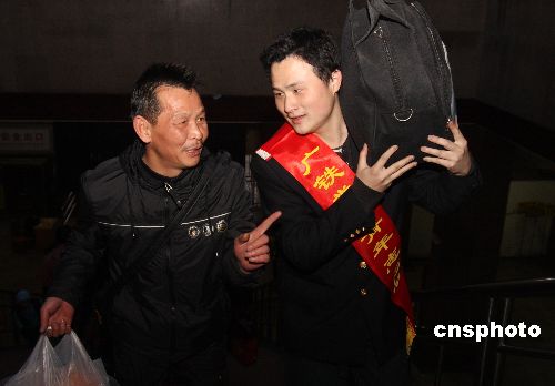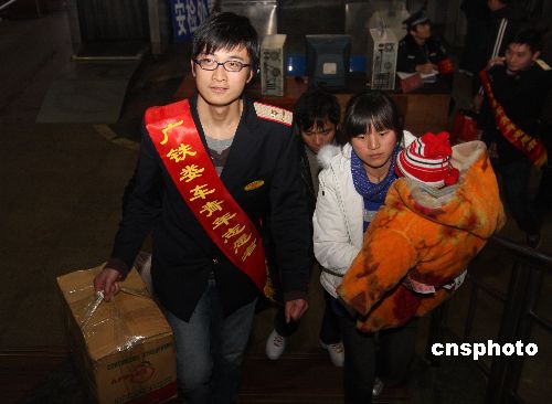 1月29日,湖南省婁底車務段的青年志愿者在婁底火車站為攜帶許多行李等老弱病殘等旅客提供各種幫助。當日,湖南省婁底火車站迎來節(jié)后返程客流小高峰,婁底車務段團委組織近千名團員青年志愿者開展“和諧春運”活動,在管區(qū)內(nèi)的車站設立了被旅客稱為“愛心島”的青年志愿者服務站,為旅客提供溫馨服務。中新社發(fā) 郭國權(quán) 攝