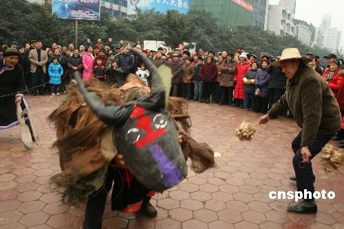 1月30日,農(nóng)歷正月初五,四川省洪雅縣瓦屋山鎮(zhèn)復(fù)興村84歲村民毛清全帶領(lǐng)該村10多名村民,到眉山市城區(qū)表演當(dāng)?shù)孛袼住芭簾簟薄?/p>