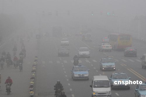2009年2月1日,江蘇淮安街頭被大霧籠罩。當日是節(jié)后上班的第一天,也是農(nóng)民工返城的高峰期,大霧給春運產(chǎn)生一定的影響。中新社發(fā) 賀敬華 攝