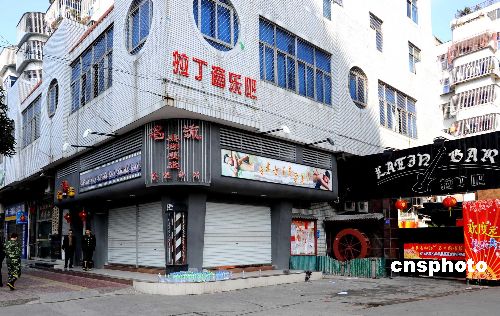 一月三十一日二十三時五十五分,福建福州長樂市區(qū)鄭和路北側(cè)的“拉丁”酒吧內(nèi),因年輕人開生日聚會在桌面上燃放煙花,引燃天花板釀成特大火災,現(xiàn)已導致十五人死亡,還有三人正在搶救中。圖為二月一日上午,警方繼續(xù)在發(fā)生火災的酒吧展開調(diào)查。中新社發(fā) 鄭祚聲 攝