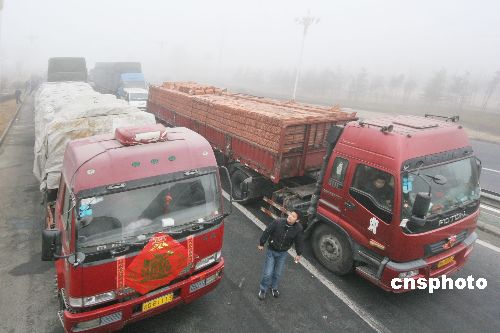 2009年2月1日上午,在同三高速公路江蘇省贛榆縣出口處,車輛等待霧散通行。連日來,江蘇省大部分地區(qū)遭遇持續(xù)大霧天氣,部分地區(qū)能見度不足50米,給旅客出行及運輸帶來影響。當(dāng)?shù)貧庀蟛块T發(fā)布大霧黃色預(yù)警,交通安全部門提醒旅客要注意出行安全。中新社發(fā) 司偉 攝