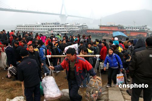 2月3日農(nóng)歷正月初九早8時(shí),長江宜昌港大公橋客運(yùn)碼頭四條躉船無一客人、無一客船,9時(shí),9艘客船同一船閘、同時(shí)停泊宜昌港,一時(shí)間,涌入宜昌港口的出川大軍疏散成“井噴”之勢。宜昌海事、公安、港口等部門聯(lián)動(dòng)執(zhí)法,35分鐘時(shí)間內(nèi)緊急疏散4500余人,全部是出川農(nóng)民工。據(jù)統(tǒng)計(jì),三峽春運(yùn)期間,常年旅客進(jìn)出客流量約50萬人次,其中外出農(nóng)民工乘船超過40余萬人次。據(jù)悉,三峽庫區(qū)是長江干線跨省春運(yùn)重點(diǎn)航線,而這一航線又是中國內(nèi)河農(nóng)民工乘船的專營航線,節(jié)前單邊返鄉(xiāng)過年,節(jié)后單邊出川進(jìn)城打工,客船單邊旅客、客船高度集中,是中國內(nèi)河不多見的春運(yùn)現(xiàn)象。中新社發(fā) 望作信 攝