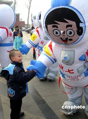 2月4日,《飛天壯歌——中國首次太空漫步航天展》新聞發(fā)布會現(xiàn)場,河北兒童與扮成“航天員”的工作人員握手!讹w天壯歌——中國首次太空漫步航天展》全國巡展即將于2月13日在河北省石家莊市啟動。主辦方稱,這是中國航天史上規(guī)模最大、規(guī)格最高的航天尖端科技成就展,將有大量神七航天實物現(xiàn)場展出,包括神七宇宙飛船返回艙、價值三千萬元人民幣的宇航員艙外航天服、火箭整流罩殘骸,以及翟志剛遨游太空出艙時揮舞的國旗等重要實物。中新社發(fā) 牛琳 攝