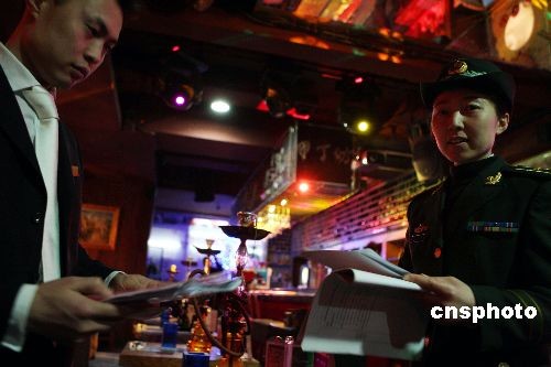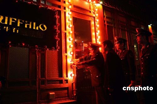 二月五日晚,北京西城消防支隊對轄區(qū)的什剎海酒吧街進(jìn)行安全檢查,杜絕火災(zāi)隱患。中新社發(fā) 任海霞 攝