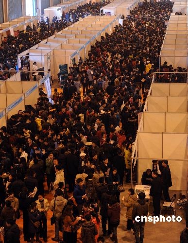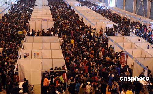 2009年2月6日,2009山東半島城市群春季人才交流暨黃河三角洲開發(fā)人才招聘大會(huì)在山東濰坊舉行,吸引數(shù)萬應(yīng)聘者到場。中新社發(fā) 王志德 攝