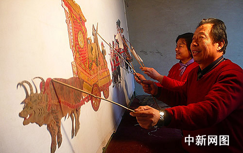 中新網(wǎng)2月6日電(馮文芳)2月5日,山西省侯馬市西侯馬村,皮影戲傳承人李世偉、皮影雕刻大師趙翠蓮夫婦耍起牛車和影人,表演皮影戲《鬧社火》,慶祝傳統(tǒng)元宵佳節(jié)。夫婦倆邊操作邊演唱,字正腔圓的唱段、妙趣橫生的臺詞、活靈活現(xiàn)的表演,受到鄉(xiāng)親們的歡迎。人們紛紛落座觀看,盡情享受這一獨具魅力的民間文化大餐。