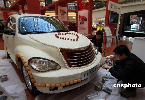 2月8日,上海兩位巧克力工藝師用兩天的時(shí)間、超過(guò)200公斤白巧克力原料,精心打造一款時(shí)尚酷車(chē),浪漫約會(huì)即將到來(lái)的“情人節(jié)”。中新社發(fā) 潘索菲 攝