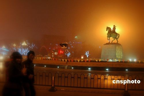 從2月7日晚起,江蘇鹽城市及蘇北地區(qū)出現(xiàn)春節(jié)后的首場大霧,城市街道夜晚能見度不足50米。氣象專家說,由于立春以來的氣溫不斷回升,冷暖空氣交會,近日早晚還將持續(xù)大霧天氣,提請出行的人們和車輛注意交通安全。中新社發(fā) 周晨陽 攝