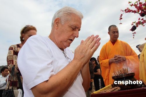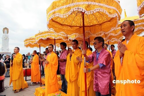 2月9日元宵節(jié),海南三亞南山寺全體僧眾在三亞南山文化旅游區(qū)內(nèi)的108米南海觀音圣像前舉行祈福法會,共唱佛贊,并放飛和平鴿,祈愿國泰民安、萬家團(tuán)圓。本次祈福法會吸引了近3000多名信眾和游客參加。中新社發(fā) 陳文武 攝