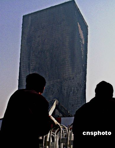 2月10日,兩位北京市民在被燒毀的央視大樓北樓下駐足觀看。9日晚,中央電視臺(tái)新址配樓發(fā)生意外大火,六小時(shí)后明火被撲滅。中新社發(fā) 鄒憲 攝