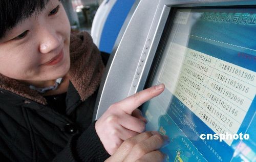 2月21日,中國(guó)移動(dòng)3G手機(jī)“188”號(hào)段放號(hào)進(jìn)入第二天,北京市民在營(yíng)業(yè)廳內(nèi)的自動(dòng)終端前挑選自己滿意的手機(jī)號(hào)碼。2月20日起北京移動(dòng)正式對(duì)188號(hào)段進(jìn)行放號(hào),188號(hào)段SIM卡是特別針對(duì)3G終端,只能在移動(dòng)3G終端上使用,北京的手機(jī)用戶開(kāi)始進(jìn)入了3G時(shí)代。中新社發(fā) 鄭雄增 攝