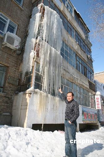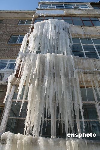 2月22日,在新疆阿勒泰市團(tuán)結(jié)南路一居民樓上驚現(xiàn)壯觀的冰瀑奇觀,家住此樓的宋正國(guó)等四戶居民身受其擾。居民樓共四層冰瀑一直從三樓垂到一樓,十分壯觀。中新社發(fā) 唐曉波 攝