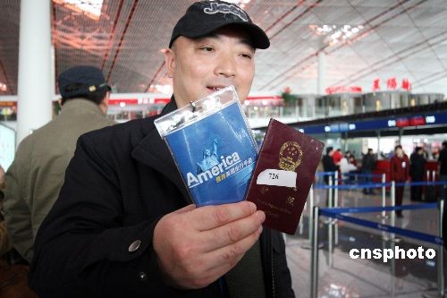 中國(guó)首個(gè)赴美購(gòu)房團(tuán)于2月24日在首都機(jī)場(chǎng)乘坐13點(diǎn)40分的國(guó)際航班啟程赴美。登機(jī)前,赴美購(gòu)房團(tuán)舉行了簡(jiǎn)單的出發(fā)儀式。赴美購(gòu)房團(tuán)登機(jī)前,搜房網(wǎng)對(duì)團(tuán)員進(jìn)行了問(wèn)卷調(diào)查,結(jié)果顯示,在計(jì)劃行程中的五個(gè)美國(guó)城市中,紐約以36.84%的高支持率成為最受關(guān)注的城市,接下來(lái)依次為洛杉磯、舊金山、波士頓和拉斯維加斯。中新社發(fā) 王昊 攝