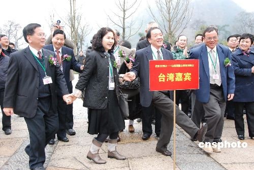 2009年2月24日上午,在浙江省杭州市天目山山腳下,天目山與阿里山的代表舉行了“杭州天目山——臺灣阿里山締盟姐妹山”合約簽字儀式,聯(lián)手推介旅游項目。在儀式現場代表們手拉手跳起了阿里山的傳統(tǒng)舞蹈。中新社發(fā) 姜越潮 攝
