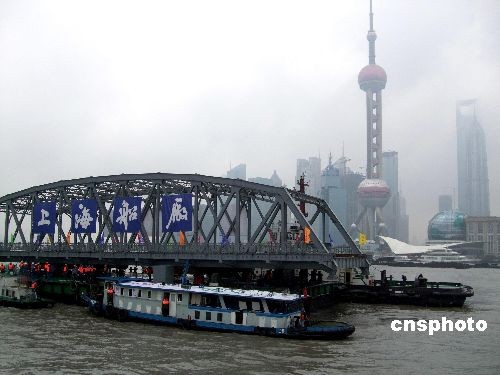 2月25日上午11時左右,經(jīng)歷四個多小時“回家之旅”的上海百年外白渡橋,到達(dá)黃浦江與蘇州河交匯口,在東方明珠面前完成一百八十度“轉(zhuǎn)身”。中新社發(fā) 鄭瑩瑩 攝