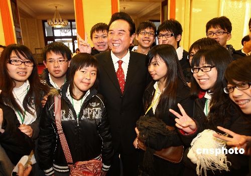 2月25日,海峽兩岸關系協(xié)會會長陳云林,在北京會見來京交流的廣東東莞臺商子弟學校董事長葉宏燈及其率領的該校校董和160多名師生。圖為陳云林和臺商子弟學校學生親切交流并合影。中新社發(fā) 杜洋 攝