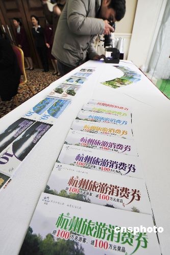 2月26日,杭州市宣布“杭州旅游消費(fèi)券”發(fā)放及使用說明,并開始正式面向以長三角地區(qū)為重點(diǎn)的國內(nèi)及港澳臺(tái)旅游市場(chǎng)免費(fèi)發(fā)放240萬份總面值為1.5億元的“杭州旅游消費(fèi)券”,從2009年3月1日起至5月31日止,持券游客來杭旅游可在指定商家使用并享受相應(yīng)的優(yōu)惠。 中新社發(fā) 李忠 攝