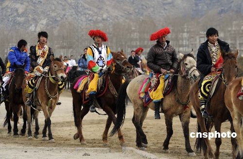 2月27日,中國(guó)藏歷年初三,拉薩賽馬場(chǎng),傳統(tǒng)賽馬與表演活動(dòng)開(kāi)幕,參賽選手身穿傳統(tǒng)民族服裝亮相。中新社發(fā) 廖攀 攝