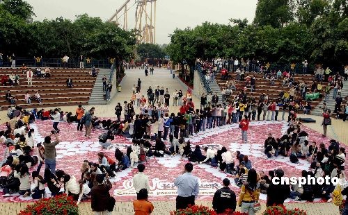 三月一日,為慶祝“三八”婦女節(jié)的即將到來,三百多名女士齊聚廣州長隆歡樂世界挑戰(zhàn)“人肉多米諾”骨牌。圖為蝴蝶形狀的骨牌圖案逐漸散開,場面壯觀。中新社發(fā) 劉衛(wèi)勇 攝